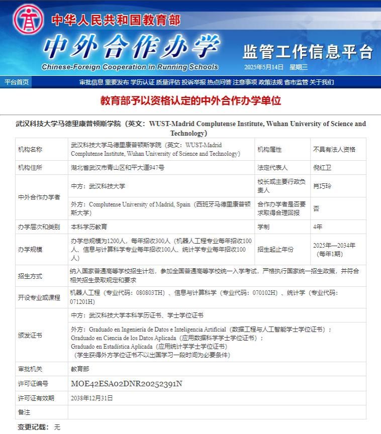 近日,教育部中外合作辦學監(jiān)管工作信息平臺公布了教育部予以資格認定的中外合作辦學單位。我校與西班牙馬德里康普頓斯大學合作設立的永利集團88304官網(wǎng)馬德里康普頓斯學院(英文:WUST-Madrid Complutense Institute,Wuhan University of Science and Technology)位列其中。
