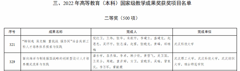 7月24日,教育部發(fā)布關(guān)于批準2022年國家級教學(xué)成果獎獲獎項目的決定。我校吳懷宇教授參與完成的“‘鑄鋼魂 深交融 重挑戰(zhàn) 強協(xié)同’冶金類新工科人才培養(yǎng)體系探索與實踐”喜獲高等教育(本科)國家級教學(xué)成果獎二等獎。