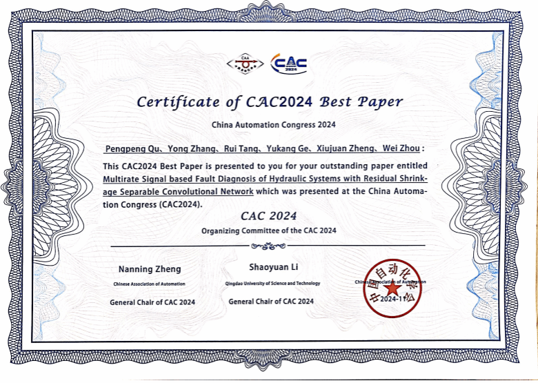 近日,在山東省青島市舉行的2024中國(guó)自動(dòng)化大會(huì)(CAC2024)上,集團(tuán)碩士生屈鵬鵬和博士生周煒在張永教授的指導(dǎo)下合作的論文《Multirate Signal based Fault Diagnosis of Hydraulic Systems with Residual Shrinkage Separable Convolutional Network》,榮獲CAC2024最佳論文獎(jiǎng)。大會(huì)共接收論文1500篇,評(píng)選出12篇最佳論文。