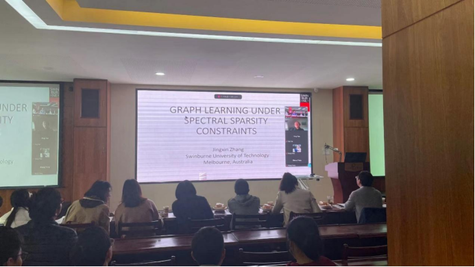 斯威本科技大學電氣工程,澳大利亞墨爾本莫納什大學電氣和計算機系統(tǒng)工程張競新副教授做題為“Graph learning under spectral sparsity constraints”的報告。報告介紹了一種基于信號處理的推理模型,該模型允許數(shù)據(jù)中的寬帶頻率變化,并提出了一種圖形推理算法。