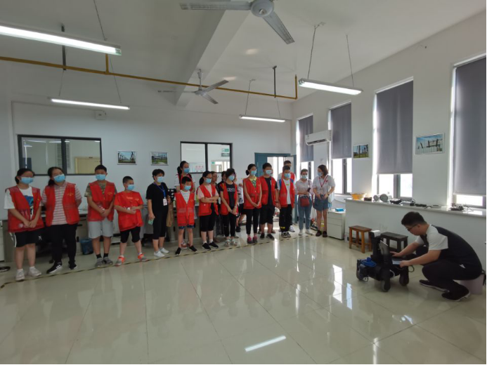 學生們首先參觀了地面巡視機器人。研究生志愿者劉晨給學生們講解了地面巡視機器人的工作原理和功能。據(jù)他介紹,地面巡視機器人是一款綜合運用物聯(lián)網(wǎng)、人工智能、云計算、大數(shù)據(jù)等技術(shù),集成環(huán)境感知、動態(tài)決策、行為控制和報警裝置,具備自主感知、自主行走、自主保護、互動交流等能力,可幫助完成基礎(chǔ)性、重復性、危險性巡檢工作的智能機器。為了解決特殊環(huán)境下的人工巡檢存在的安全風險,提高巡檢工作效率、發(fā)現(xiàn)和處理故障及時性等問題,就產(chǎn)生了智能巡檢機器人。目前,團隊正在開展變電站巡檢機器人研究。為了給學生們視角上的沖擊,劉晨現(xiàn)場調(diào)試程序,演示了機器人巡檢工作時的情況,學生們認真傾聽、仔細觀看,贊嘆和渴望知識的神情躍然臉上。